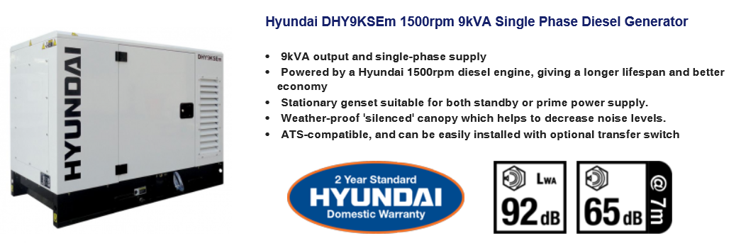 Hyundai DHY9KSEm 1500rpm 9kVA Single Phase Diesel Generator